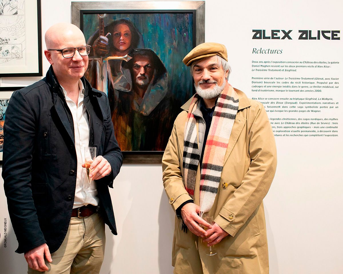 PROLONGATION DE L'EXPOSITION JUSQU'AU 31 MARS La galerie Daniel Maghen est fière de consacrer une exposition à Alex Alice autour de ses séries Le Troisième Testament (éd. Glénat) et Siegfried (éd. Dargaud), du 27 février au 14 mars 2020. Avec Le Troisième testament, Alex Alice et Xavier Dorison ont donné naissance à une série culte des années 1990-2000. Le duo réinvente le mythe du troisième testament à travers un récit noir et ésotérique qui se déroule dans une Europe gouvernée par la religion chrétienne au début du XIVe. Une vaste enquête mystique superbement rendue par le dessin d’Alex Alice, dont le trait réaliste et le découpage ultra dynamique offre de magistrales scènes de bataille et des atmosphères à couper le souffle. Une soixantaine de planches originales noir et blanc, accompagnées de leurs mises en couleur seront présentées, ainsi que des peintures inspirées de la saga. L’exposition mettra également à l’honneur la deuxième bande dessinée emblématique de l’auteur : Siegfried, la toute première série dont il signe à la fois le dessin et le scénario. Inspirée du mythe nordique de L’Anneau de Nibelung, celui-là même qui a inspiré à Wagner un de ses plus beaux opéras, Alex Alice raconte le destin fabuleux de Siegfried dans sa quête pour rejoindre le monde des hommes. Un scénario audacieux, magistral et épique, servi par le dessin majestueux d’Alex Alice et sa mise en couleur quasi mystique, qui fait de cette trilogie haletante l’un des chefs-d’œuvre du genre. Les magnifiques peintures des couvertures des trois albums de la série seront présentées lors de l'exposition, ainsi qu'une sélection de 80 planches et leurs mises en couleur originale. Daniel Maghen et Alex Alice sont heureux de vous inviter au vernissage de l’exposition le vendredi 28 février à 19h.