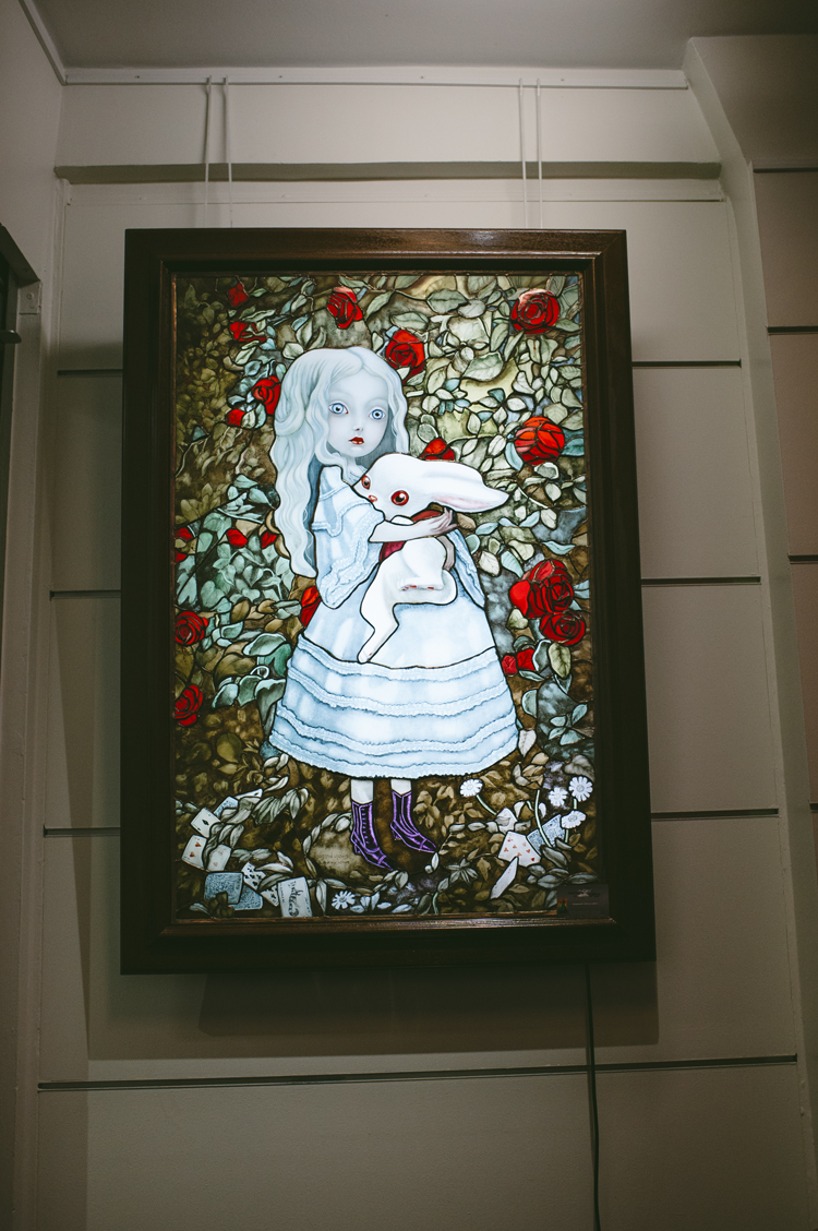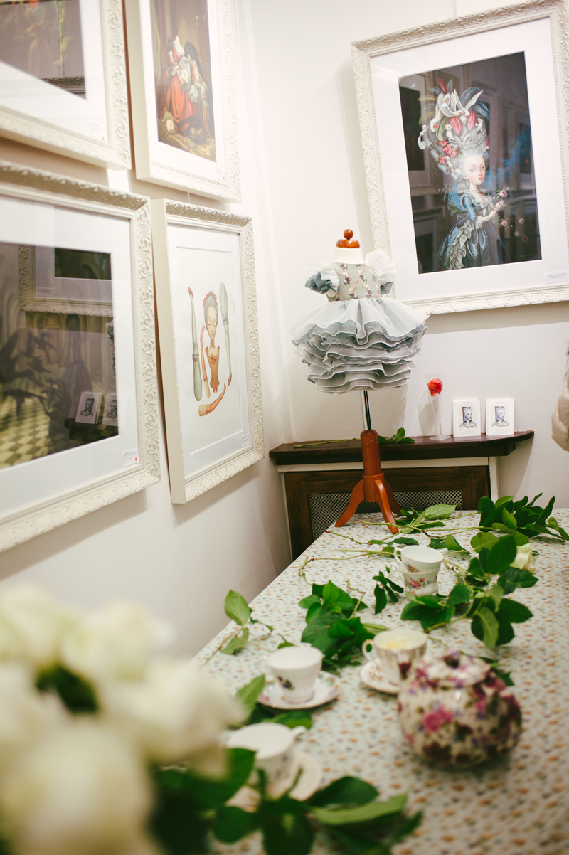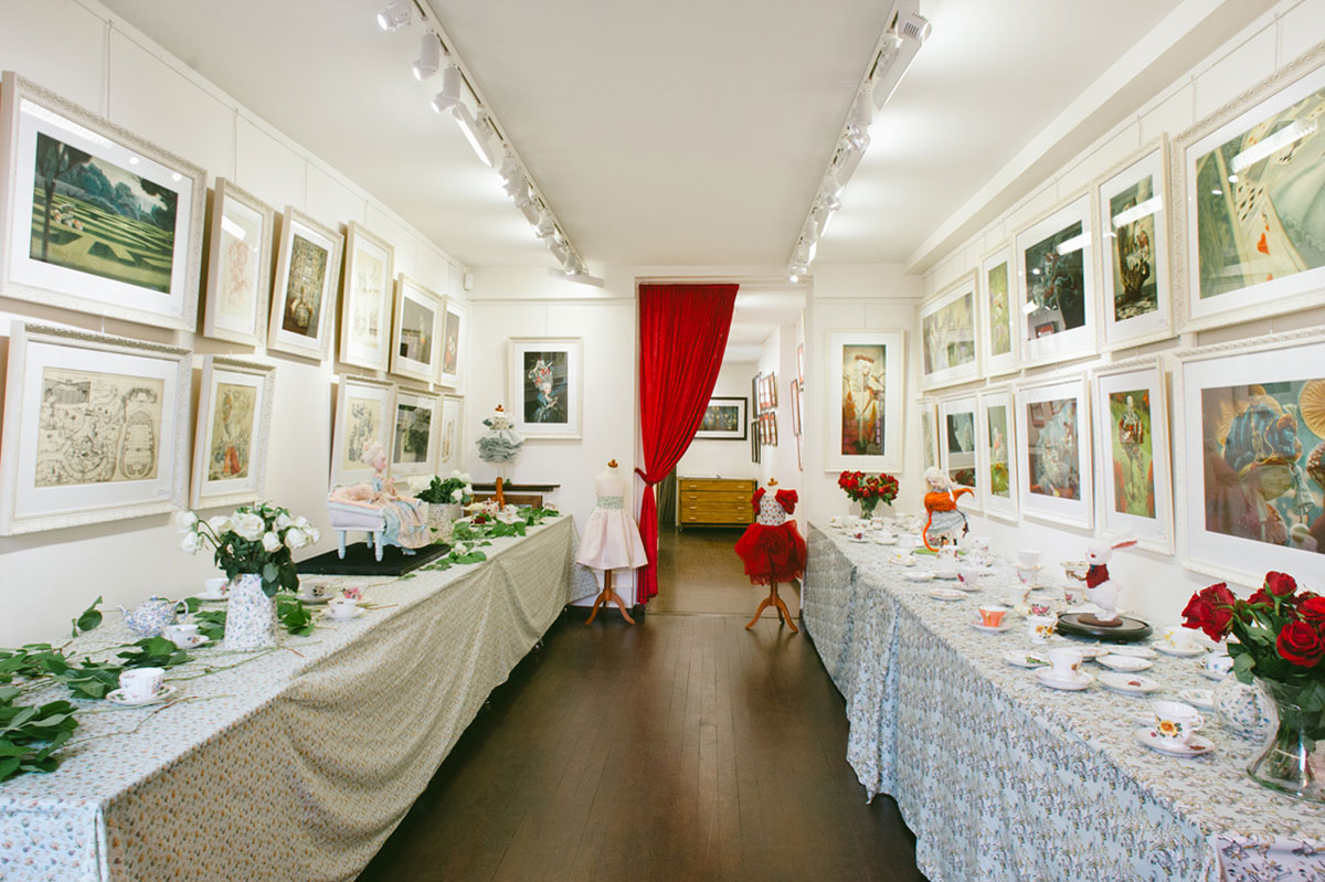Et c’est à l’occasion de la publication de cet ouvrage aux éditions Soleil-Métamorphose que l’auteur et la galerie Daniel Maghen vous invitent à une « Mad Tea-Party » dans la célèbre galerie du quai des grands Augustins, qui se verra transformée pour l’événement par une scénographie toute en fantaisie. Vous seront présentés près de 70 originaux [issus des livres : Alice aux pays des Merveilles et Marie-Antoinette, Carnet secret d’une reine (éd. Soleil-Métamorphose) ou encore Facéties de chats (éd. Margot)] ; ainsi qu’une série de volumes réalisés en collaboration avec Julien Martinez. Quelques modèles de vêtements coutures aux motifs inspirés de l’univers d’Alice, fruits de la rencontre de l’artiste avec l’atelier Cocolico (concepteur de prêt-à-porter pour enfants, éthique et fabriqué en France) seront également exposés.