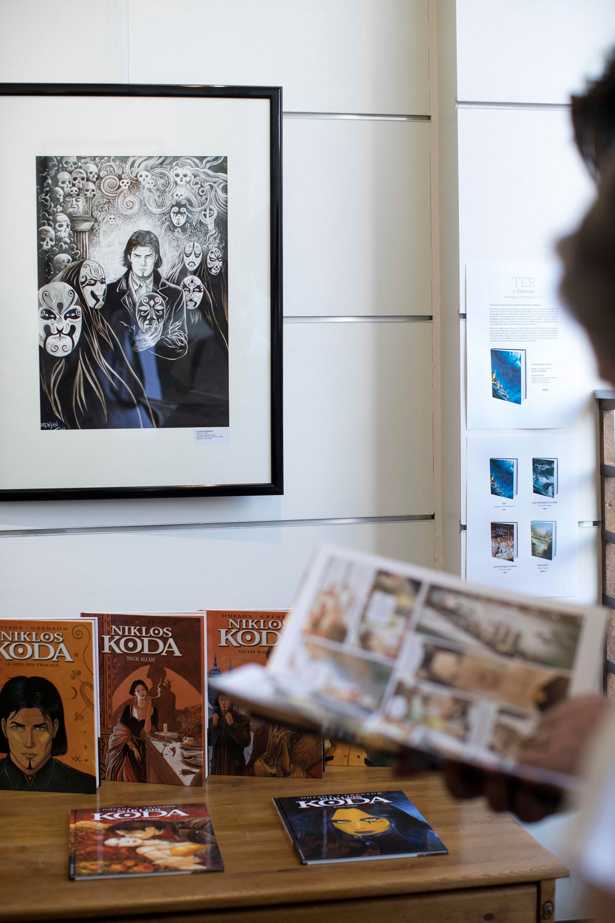 La Galerie Daniel Maghen a le plaisir d’accueillir Olivier Grenson pour une exposition dédiée à sa série phare, Niklos Koda, à l’occasion de la sortie du Dernier Masque, 15e et dernier album de cette saga. Dix-huit ans après la sortie du dyptique À l’arrière des berlines, Olivier Grenson (Carland Cross, La Femme accident) et Jean Dufaux (Djinn, Complainte des Landes perdues, Rapaces) mettent un point final à leur drame mystique. Savant mélange combinant thriller, espionnage et magie, Niklos Koda a séduit un large public et fait de cette série une référence de la bande dessinée des années 2000, avec plus de 600 000 exemplaires vendus à travers le monde. Cette troisième exposition à la galerie Daniel Maghen, réunit plus de 70 planches originales et illustrations, offrant un aperçu complet de cette série depuis la couverture du premier tome aux pages du dernier album. Le graphisme de Grenson, clair et sophistiqué, dévoile toute sa complexité et sa finesse dans ses planches au lavis et à l’encre de Chine. Une technique que l’artiste développe à partir du 11e album, dans des planches proposées pour la première fois lors d’une exposition-vente. À cette occastion, Olivier Grenson a réalisé une série de panoramas grands formats qui dénotent d’une parfaite maîtrise de son univers. Daniel Maghen, Olivier Grenson, Jean Dufaux et les éditions du Lombard sont heureux de vous convier au vernissage de l’exposition, le jeudi 1er juin à partir de 19h.