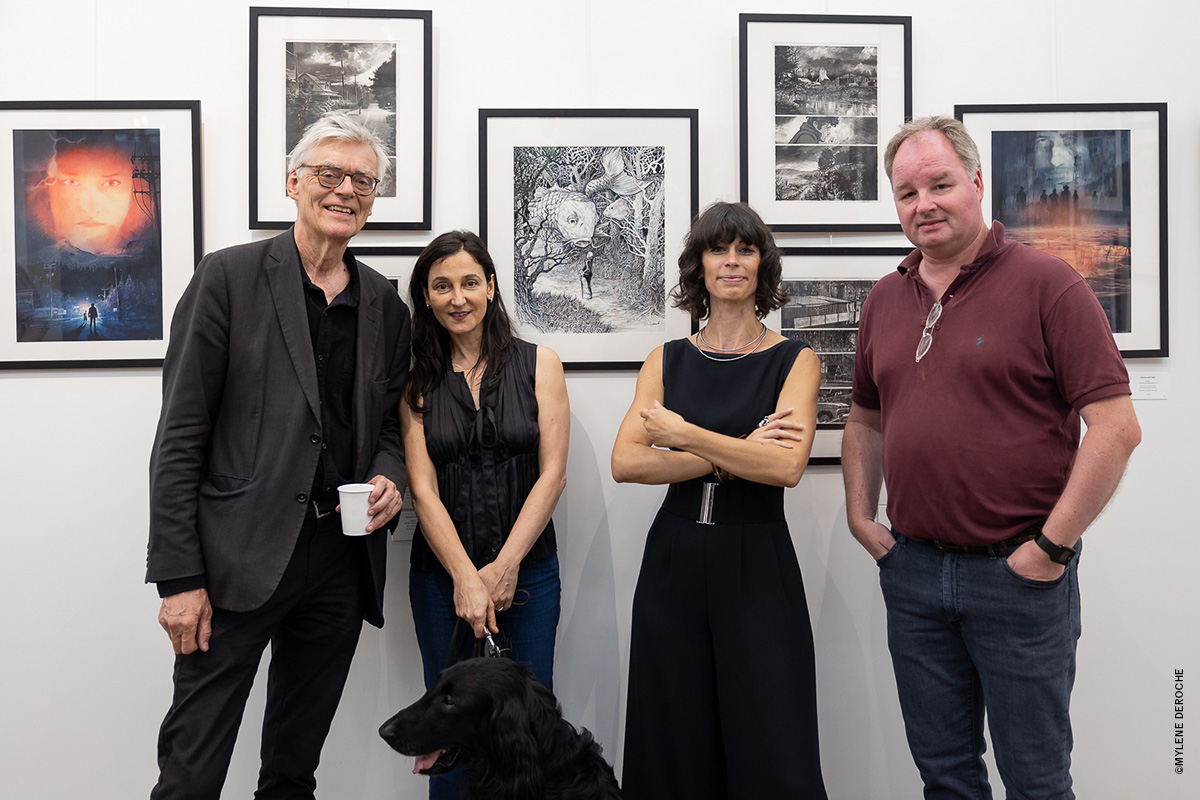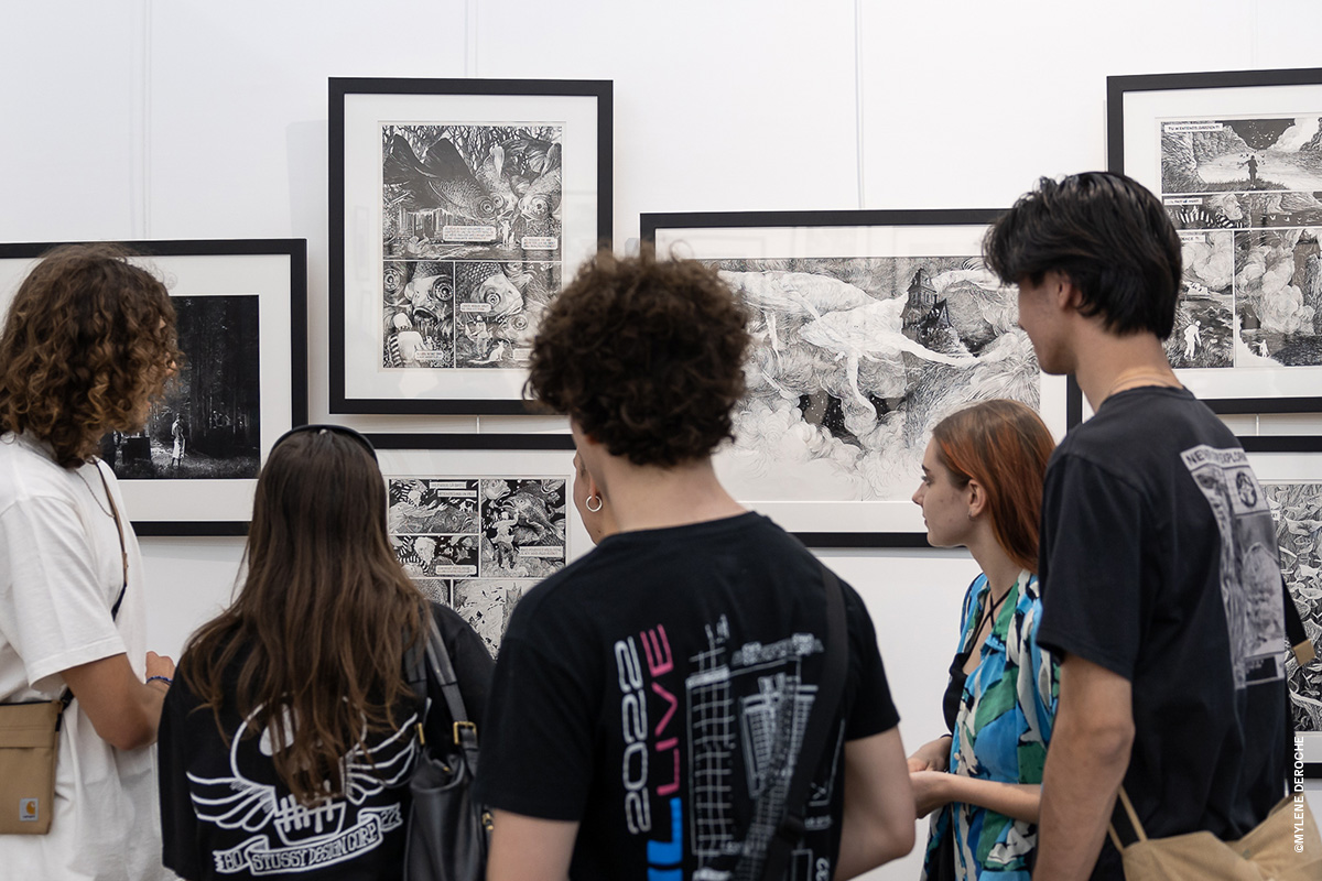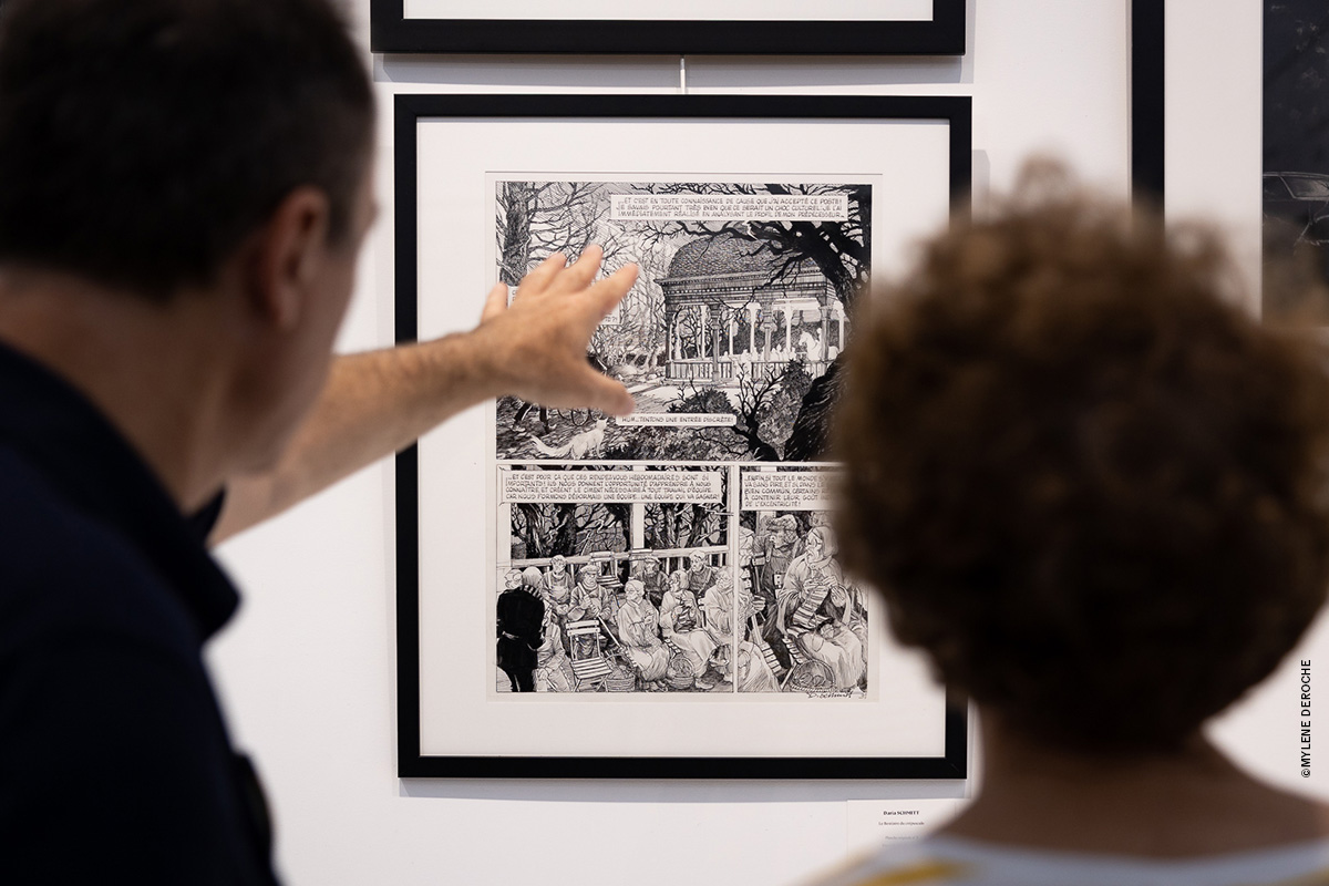 Daria Schmitt est également à l’honneur de l’exposition qui présente les originaux de son dernier album : Le Bestiaire du crépuscule, un vibrant hommage à l’univers d'H.P. Lovecraft. Plongé au cœur d’un jardin public, on suit les pérégrinations de Providence, le gardien du parc, atteint d’un solide trouble de la rêverie compulsive. Rapidement, le jardin pullule de créatures aussi merveilleuses que cauchemardesques, tout droit sorties de l’imaginaire lovecraftien. On admirera aussi la multitude d’animaux fantastiques, poissons et poulpe géants qui grouille dans ce récit. Pour décrire ce rêve éveillé, Daria Schmitt déploie l’immensité de son talent dans des planches noir et blanc fourmillant de détails. La qualité de son encrage, tout en hachures et en aplats, nous transporte dans cet imaginaire hors normes et donne toute sa force au récit. L’exposition présente également une sélection de planches de son album Ornithomaniacs, une fable gothique découlant de l’univers de Lewis Carroll.