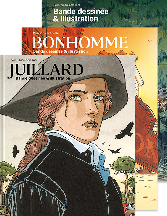 Lot des trois catalogues de la vente aux enchères "bande dessinée et illustration" organisée par Daniel Maghen Enchères et Expertises le 15 novembre 2021 à 18h à la Maison de l’Amérique Latine (Paris).