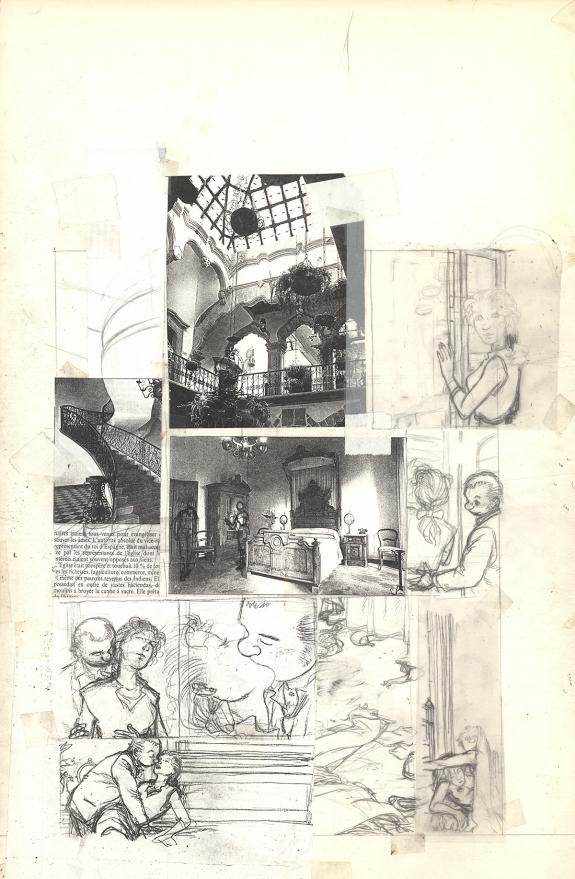 > Catalogue > Michel Plessix > Julien Boisvert > Jikuri > Planche préparatoire n°23 avec reproductions collées, et planche originale n°18 avec son lettrage collé, ainsi que recherche de couverture