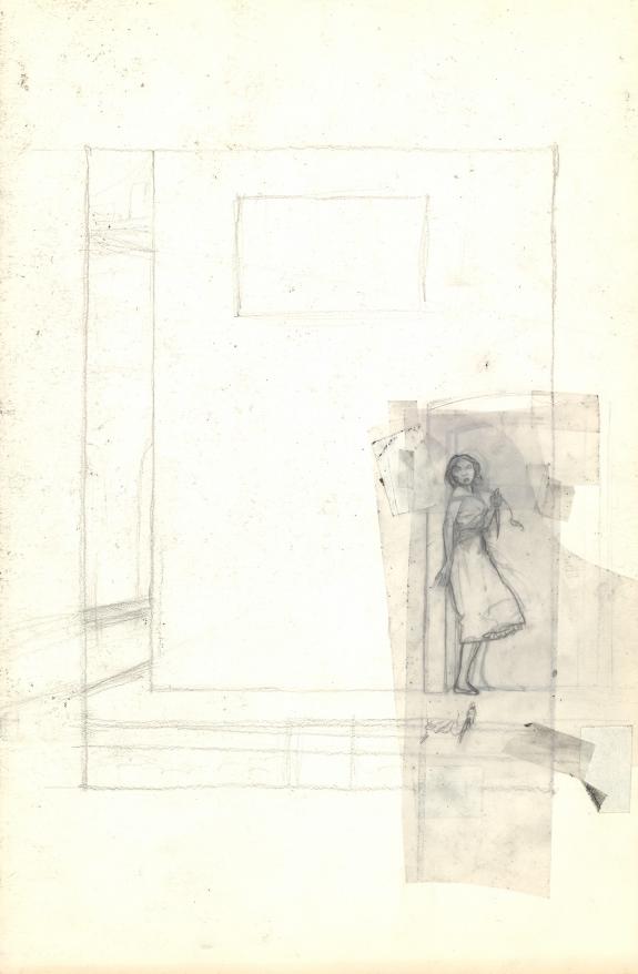 Planche préparatoire n°23 avec reproductions collées, et planche originale n°18 avec son lettrage collé, ainsi que recherche de couverture