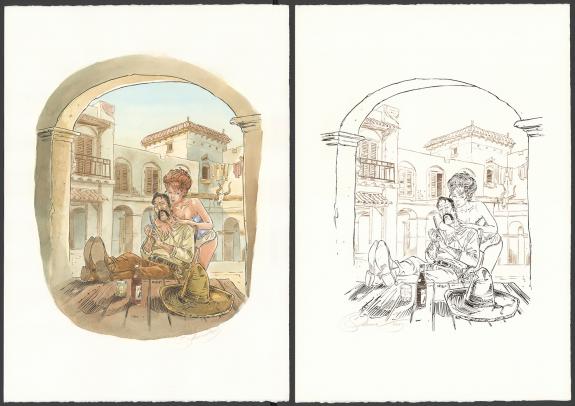 > Catalogue > Paul Salomone > L'Homme qui n'aimait pas les armes à feu > Album sans titre > Illustration originale, accompagnée de sa version couleur à l'aquarelle