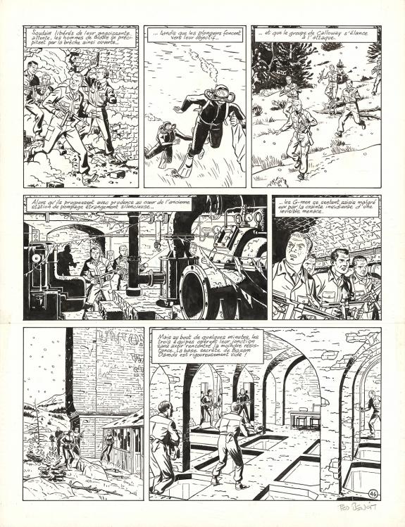 > Catalogue > Ted Benoit > Blake et Mortimer > L'Étrange Rendez-vous > Planche originale n°46 accompagnée de sa mise en couleurs à la gouache de la main de Madeleine De Mille